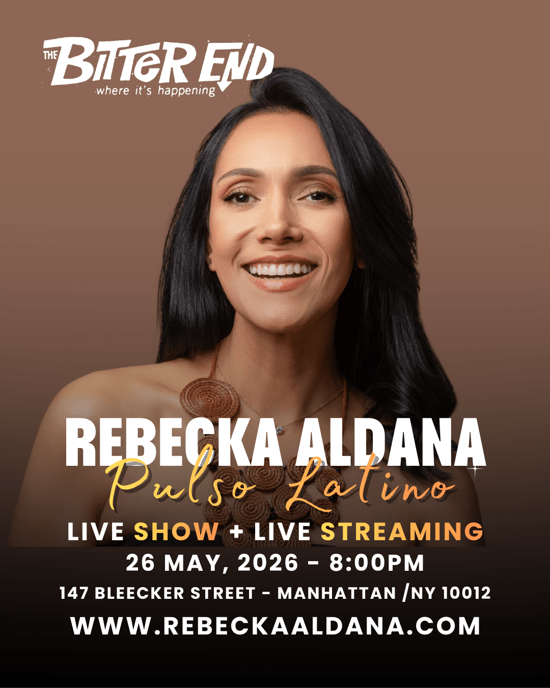 Rebecka Aldana carries the strength of Latin soul, the kind that knows loss and joy in the same breath, that speaks to the dignity of struggle and the power of resilience. In a room built for moments like this, surrounded by an audience that traveled to be there, and reaching across the entire Americas through livestream—from Managua to New York to Mexico City and beyond—Rebecka will do what she has always done: remind us that we are not alone. That our stories matter. That a woman with faith, authenticity, and an uncompromising voice can move mountains. The Bitter End has hosted legends. Now it becomes the witness to a legacy being written in real time.